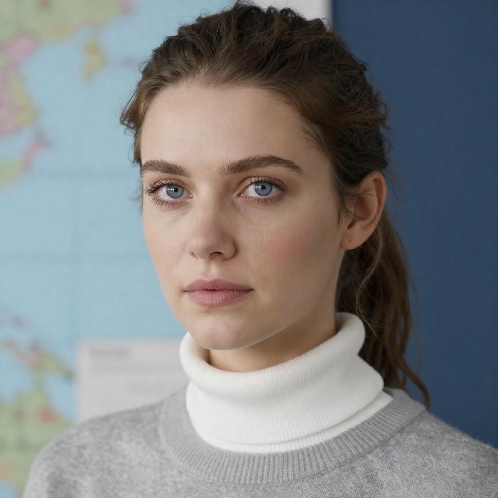 Close-up photograph of a blonde woman with fair skin and blue eyes, looking to the left with a slightly concerned expression. She has long, straight hair and is wearing a light blue sweater with a white collar. Soft yellow background. One star-shaped reflection in her left eye. Upper body visible.