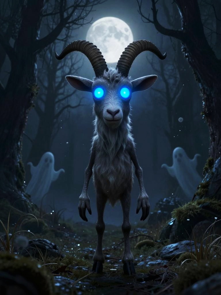 Spooky stylized goat character standing upright in the center of a dark eerie forest clearing at night, huge glowing electric blue eyes staring at the viewer, long skinny limbs and slightly exaggerated proportions, surrounded by twisted trees and faint ghostly silhouettes, glittering spores filling the air, full moon glowing in the background, cinematic wide-angle shot, dark whimsical gothic fantasy style, highly detailed 3d illustration, soft volumetric pale silver glow, high resolution