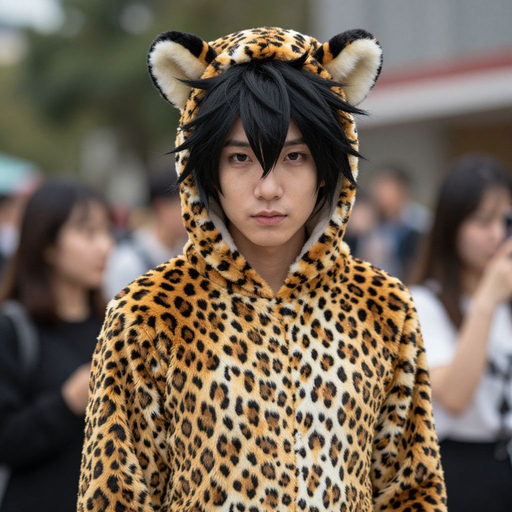 Photograph of an Asian man with black, shaggy hair, wearing a yellow, hooded, cat-eared onesie with a black belt. His expression is neutral, and he stands in a blurred urban background with indistinct people and trees. The onesie fits snugly, and the hood has large, upright, yellow cat ears. The background is slightly out of focus, emphasizing the subject. The man's skin is light, and the hood partially covers his forehead. The image has a soft, slightly overexposed look.