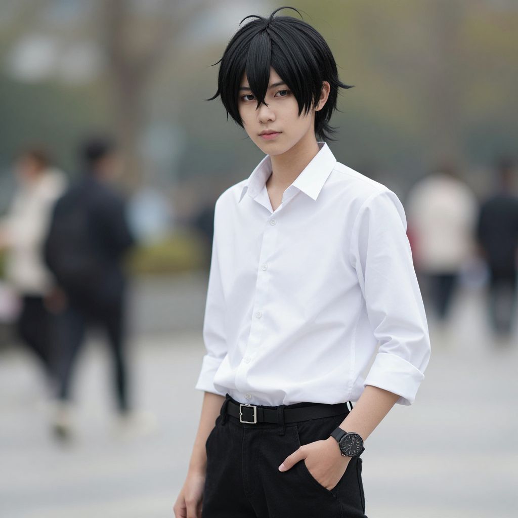 "food costume adult, solo, male focus, 1boy, blurry background, blurry, looking at viewer, outdoors, cosplay, standing, kigurumi, black hair, belt, smile Realistic photo of casual sexy person with pretty face"