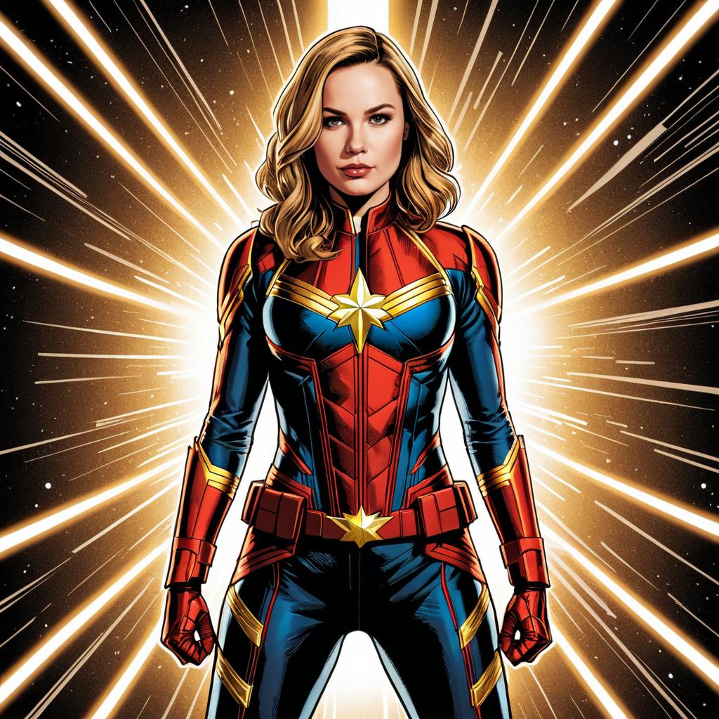Illustration of a female superhero in tight red, blue, and gold armor resembling Captain Marvel, with blonde hair. The full-body artwork features high contrast, vivid colors, rim lighting, and a radial light burst background. The character is depicted in a confident, symmetrical stance with clenched fists, inspired by comic book cover art style.