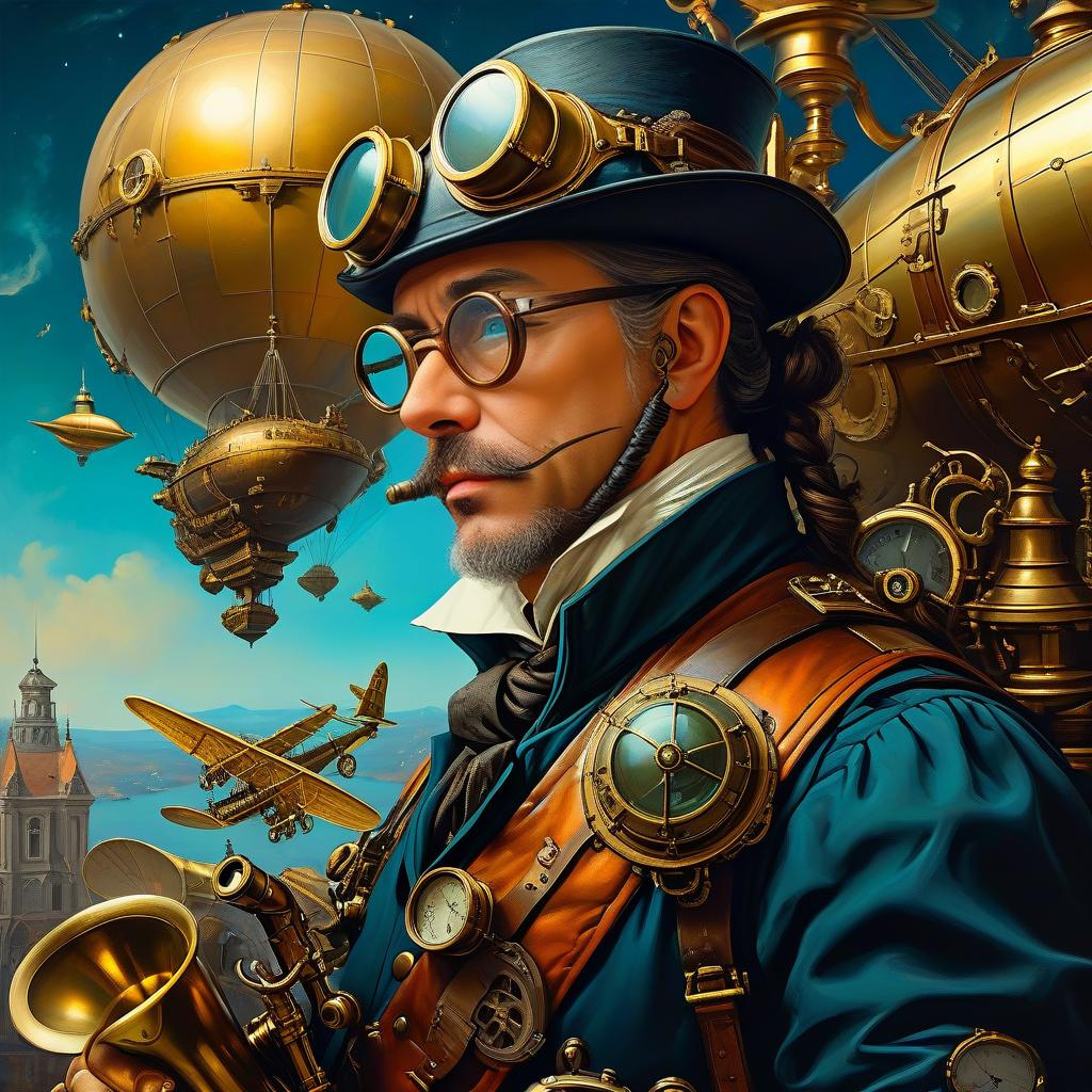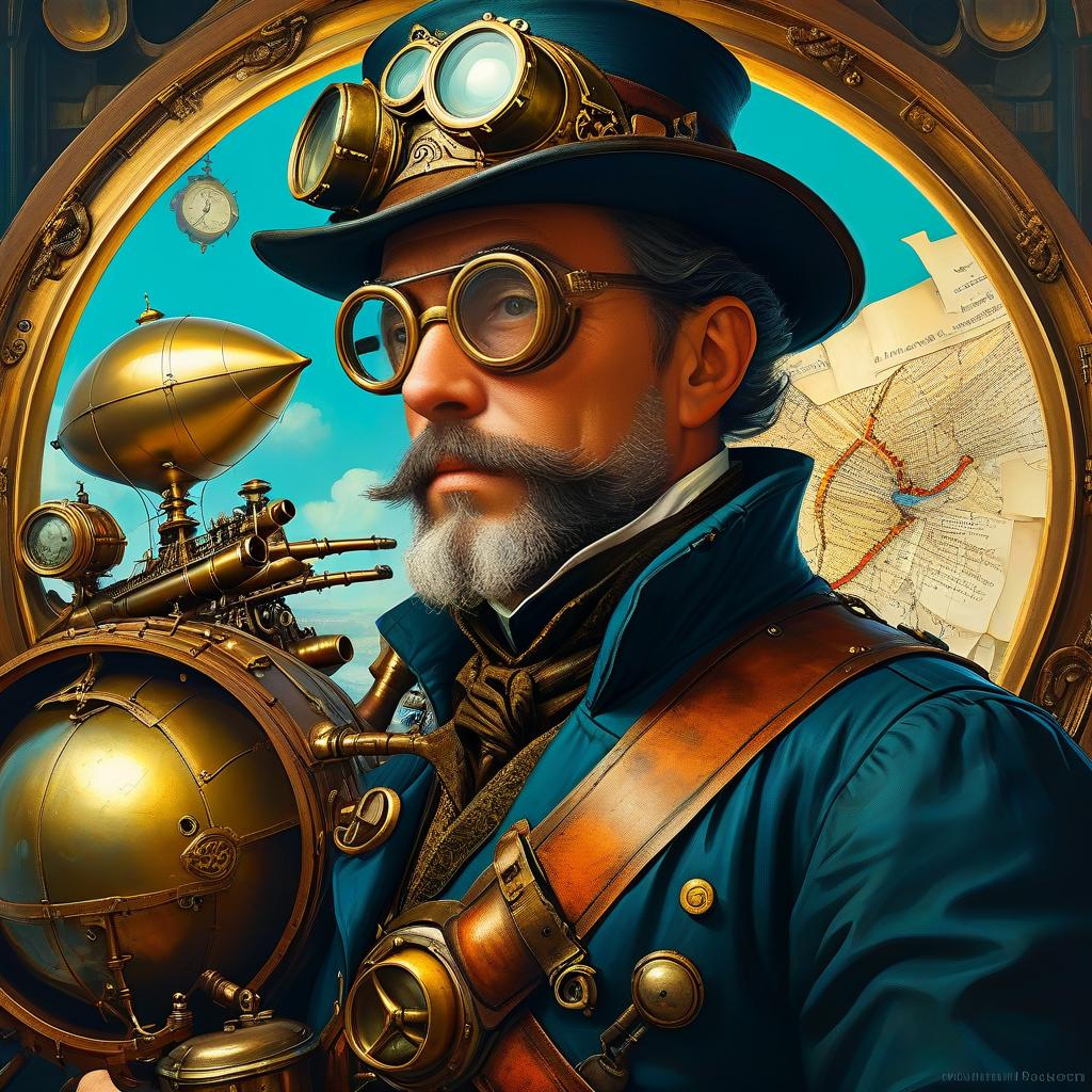 Portrait of a steampunk explorer dressed in a leather coat and top hat with goggles, surrounded by intricate brass instruments, antique maps, and airships. The scene is set against a surreal night sky filled with stars. The explorer has a prominent curled mustache and wears round spectacles, exuding a vintage sci-fi and renaissance-inspired aesthetic.