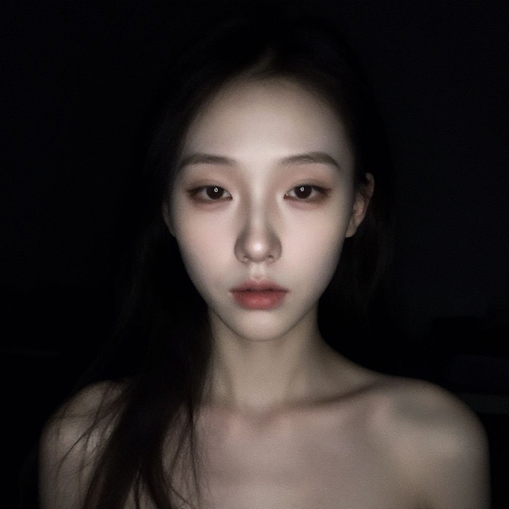 Young woman, pale, delicate, petite, flat color, lo-fi, dark, great detail, surreal, chromatic aberration, upper body shot, ((analog film lo-fi amateur photo)), cinematic shot, cinematic lighting, cinematic grain filter, EGirlMakeup, cel-shaded, movie still, webcam shot, webcam quality, minimal