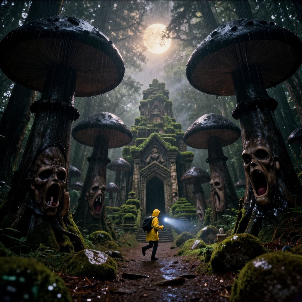 A nightmare landscape featuring an enchanted forest filled with massive, oversized black wet mushrooms with countless creepy old faces featuring with open and closed human mouth on their stems and dripping saliva sparkling in dark shadows, The forest floor is covered in rocks and soft moss, moonlight filters through a gentle mist, casting cold golden beams across the scene, A lone adventurer, a small human figure with a flashlight, yellow raincoat and a backpack, panically running away on a narrow forest path to an ancient temple ruins covered in lush moss like a mirage, emphasising the scale of the gigantic mushrooms with their various scary expressions, The atmosphere is dark, magical, with a surreal balance of realism and fantasy elements, Soft focus in the background enhances the depth and otherworldly feel, heavy raining in dark environment, inspired by Junji Ito, cult, vantage photography taken in 90s, dutch angle), glitchy borders, film grain, color channel artifacts, grainy texture, vignette, burnt edges, overexposure, soft focus or blurry edges, frame flicker, double exposure, off-center, chromatic aberration