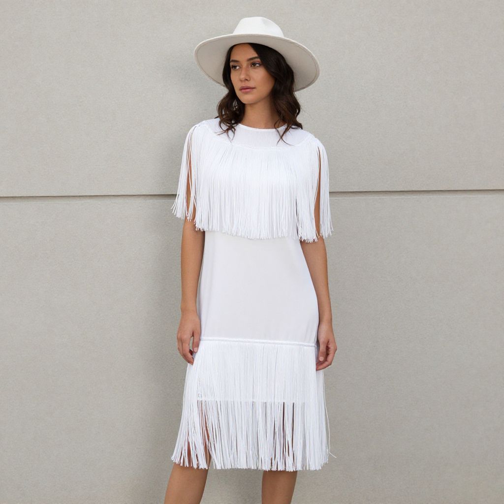 "White Western Fringe Dress, a woman in a white dress and hat standing in front of a wall"