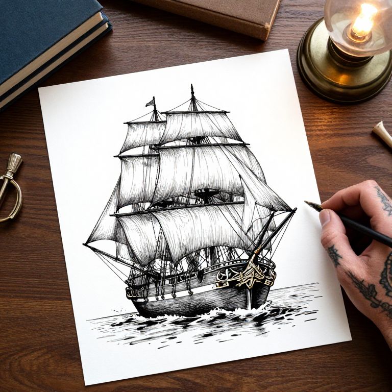 A detailed pen and ink drawing of a sailing ship on a wooden table, surrounded by books, a lamp, and a tattooed hand.