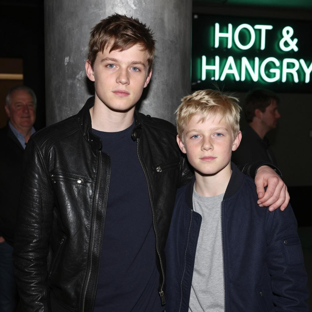 Portrait of two young boys standing in front of a metallic pillar indoors. The older boy has short brown hair and blue eyes, wearing a black leather jacket over a dark shirt. The younger boy has blond hair and blue eyes, dressed in a gray shirt with a navy jacket. The older boy's hand rests on the younger boy's shoulder. In the background, a neon sign glows with the text "HOT & HANGRY." Two blurred figures are visible further behind.
