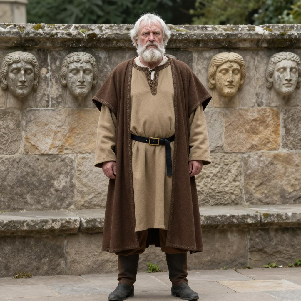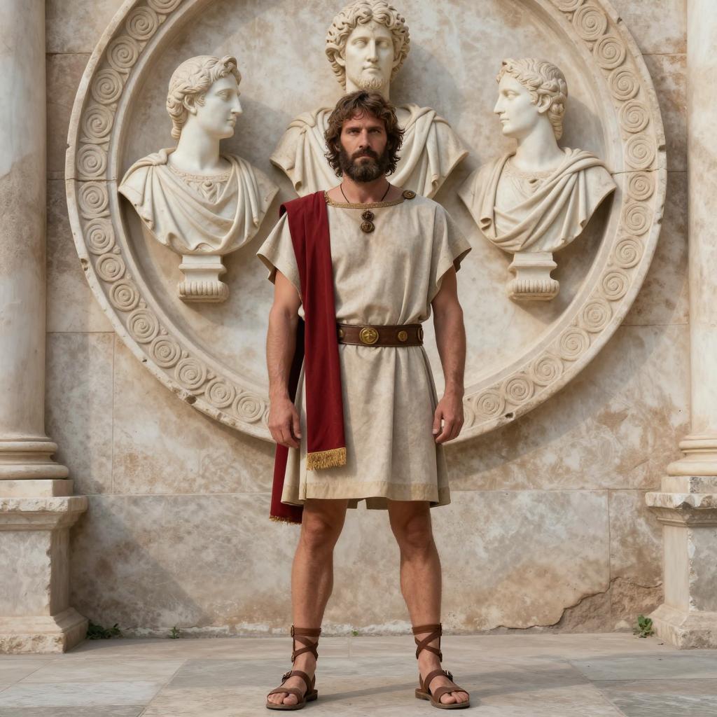 Roman holiday costume, photorealistic, male, bearded, middle-aged, standing, ancient Roman attire, beige tunic, red sash, brown belt, sandals, detailed stone wall background, circular stone relief, three busts, intricate carvings, daytime, natural light, serious expression, medium-length brown hair, traditional Roman setting, historical, realistic ures, film still, front view, centered, neutral colors, ancient architecture, detailed shadows, realistic rendering, standing posture, casual stance