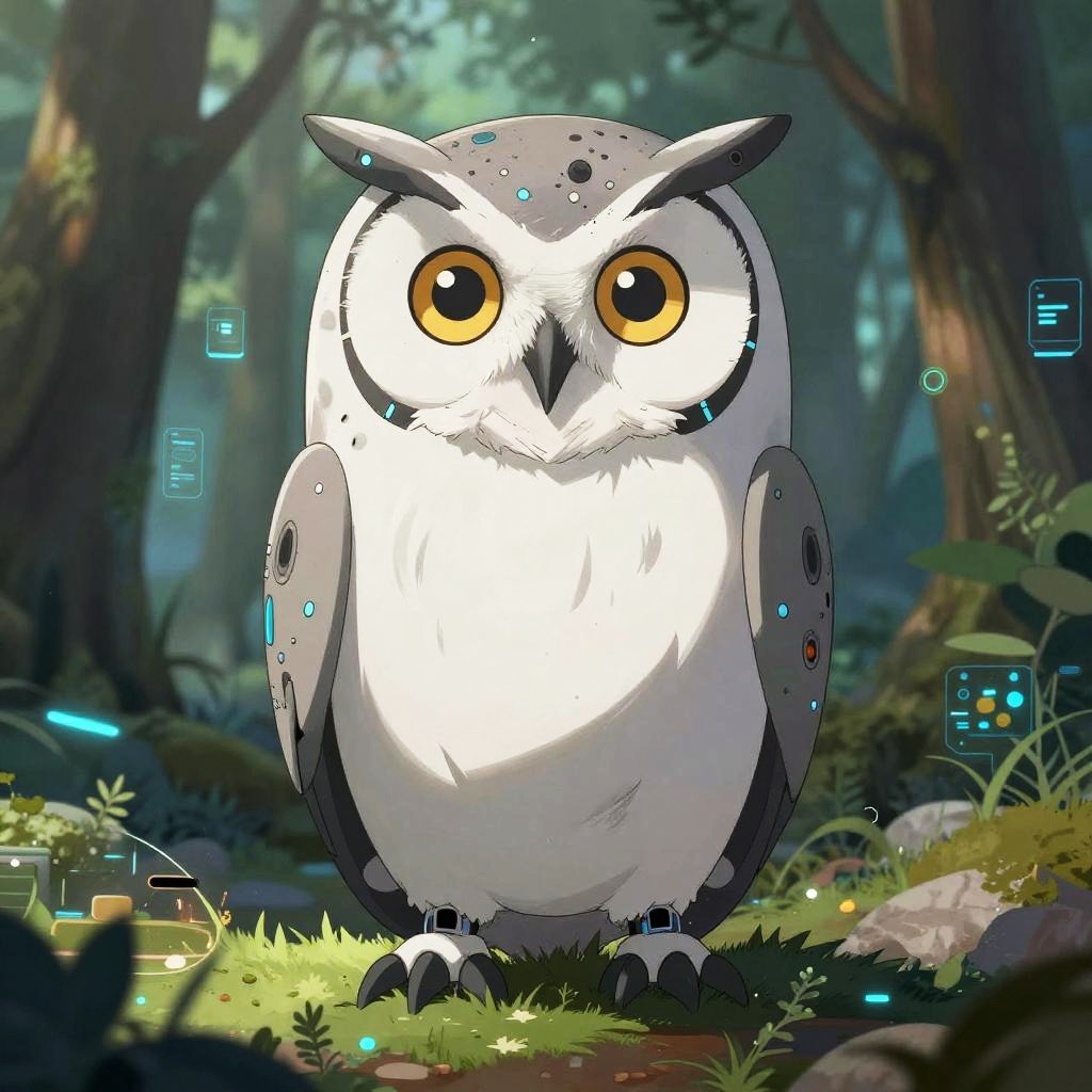 Anime art style a cybernetic owl in a futuristic digital forest