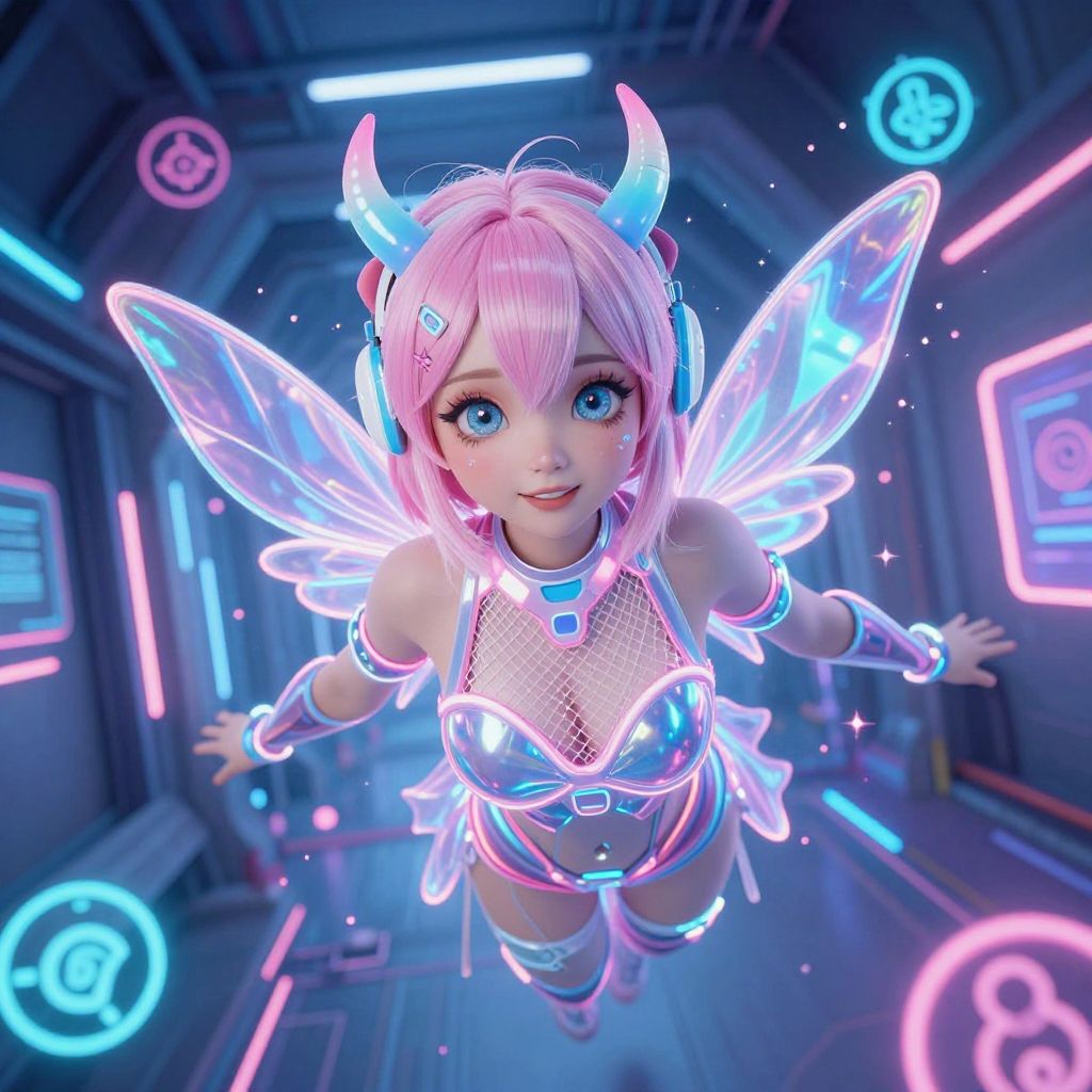 This is a vibrant, digital CGI image featuring a cute, anime-style female character with large, glowing blue eyes and pink, shoulder-length hair with white horns. She has neon pink and blue fairy wings, wearing a transparent fishnet top revealing her large breasts, a pink thong, and matching arm bands. The background is a futuristic, neon-lit corridor with blue and pink circular icons on the walls. Her expression is cheerful, and she is floating downward towards the viewer, with outstretched arms. The overall color palette is dominated by neon blues, pinks, and whites, giving a cyberpunk, fantasy aesthetic.