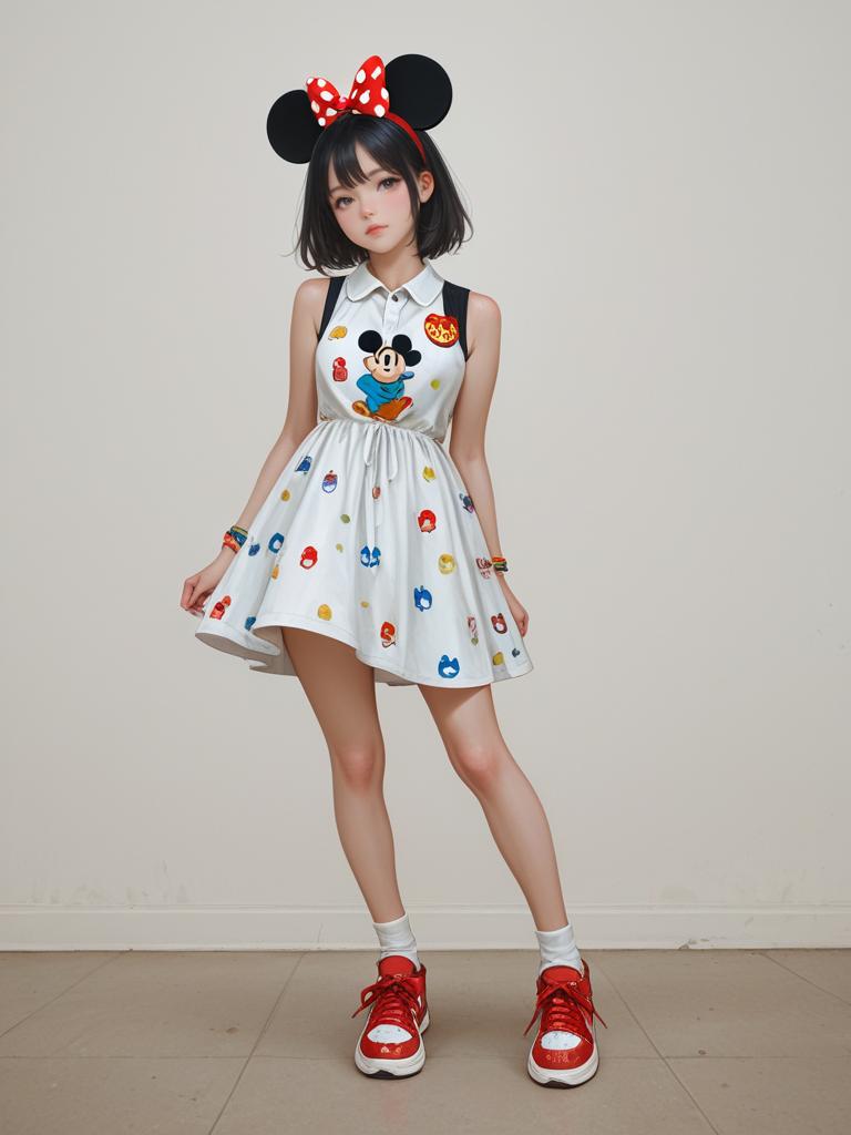 Photograph of an Asian woman with fair skin and straight black hair in a bob cut, wearing a white sleeveless dress adorned with colorful cartoon character prints, including Mickey Mouse. She has on red and white high-top sneakers, white socks, and a red polka-dotted headband with black Minnie Mouse ears. She stands against a plain white wall on a light brown tiled floor, posing with her hands by her sides and legs slightly apart, exuding a playful, cute vibe. The image has a soft, slightly overexposed light effect.