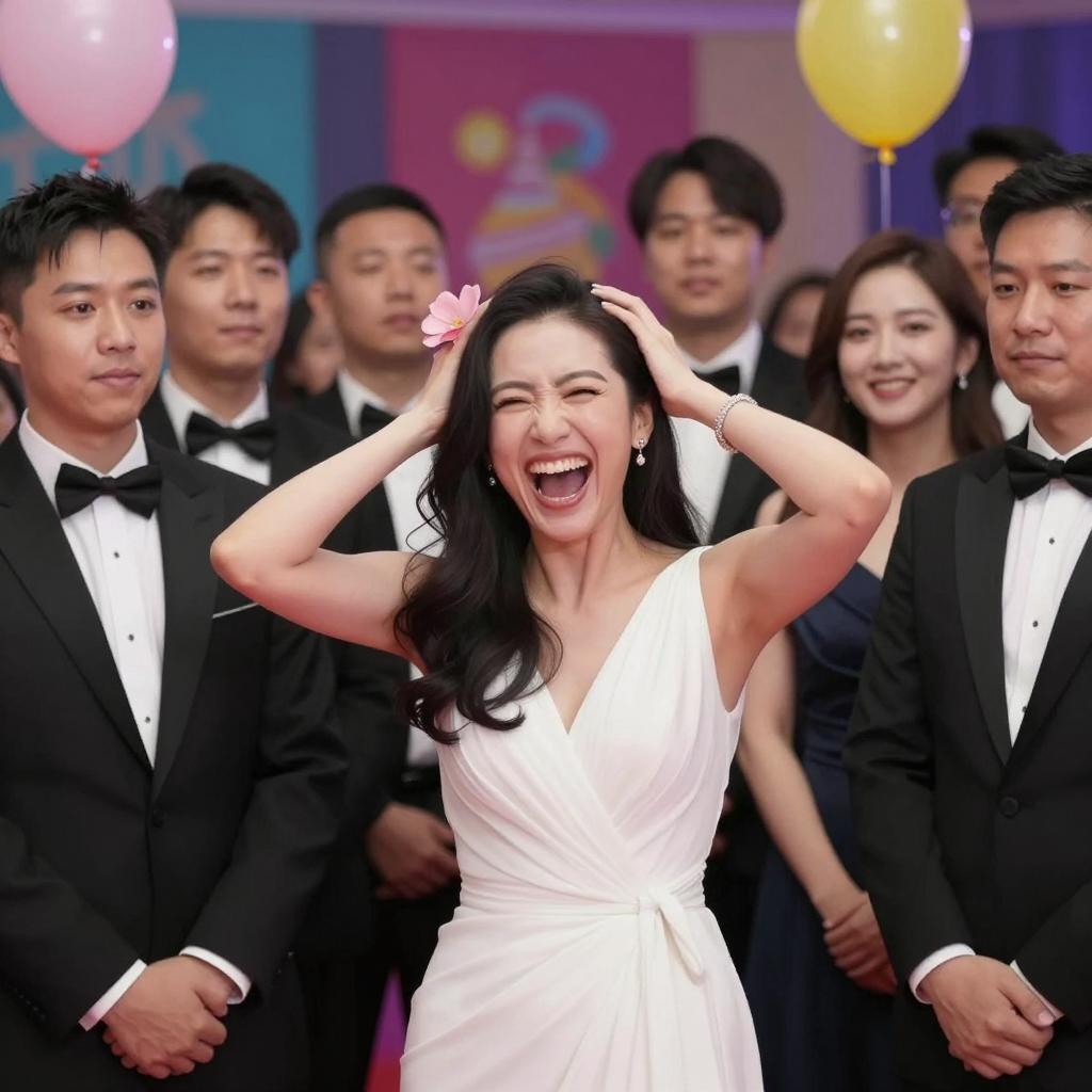 Woman in white dress with pink flower in hair, hands on head, laughing loudly in center. Surrounded by people in formal attire. Background has colorful lights, banners, and balloons. 8 men, 4 women, 2 visible balloons. Woman in front wearing silver bracelet. Men in black tuxedos, women in dark dresses. Woman laughing has light skin, black hair. Facial expressions: woman laughing intensely, others neutral or slightly amused.