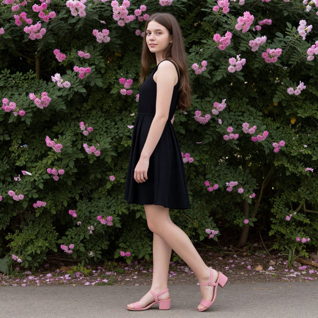 Photograph of a young woman with long, straight brown hair and fair skin, wearing a sleeveless black dress and pink wedge sandals. She is walking in profile against a lush backdrop of dark green foliage and vibrant pink flowers. The woman has a slender build and a neutral expression. The ground is gray asphalt, and the flowers are densely packed, creating a rich, colorful contrast with the dark green leaves. The lighting is natural, highlighting the colors and textures in the scene.