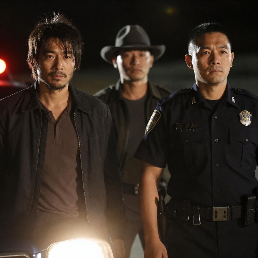 Photograph of four Asian men in a dimly lit, industrial setting. Three men stand behind a black jeep, one driving, all wearing dark clothing. The driver has a mustache, the others have short, black hair. Green and yellow lighting creates a dramatic atmosphere. The background includes concrete walls and industrial elements.