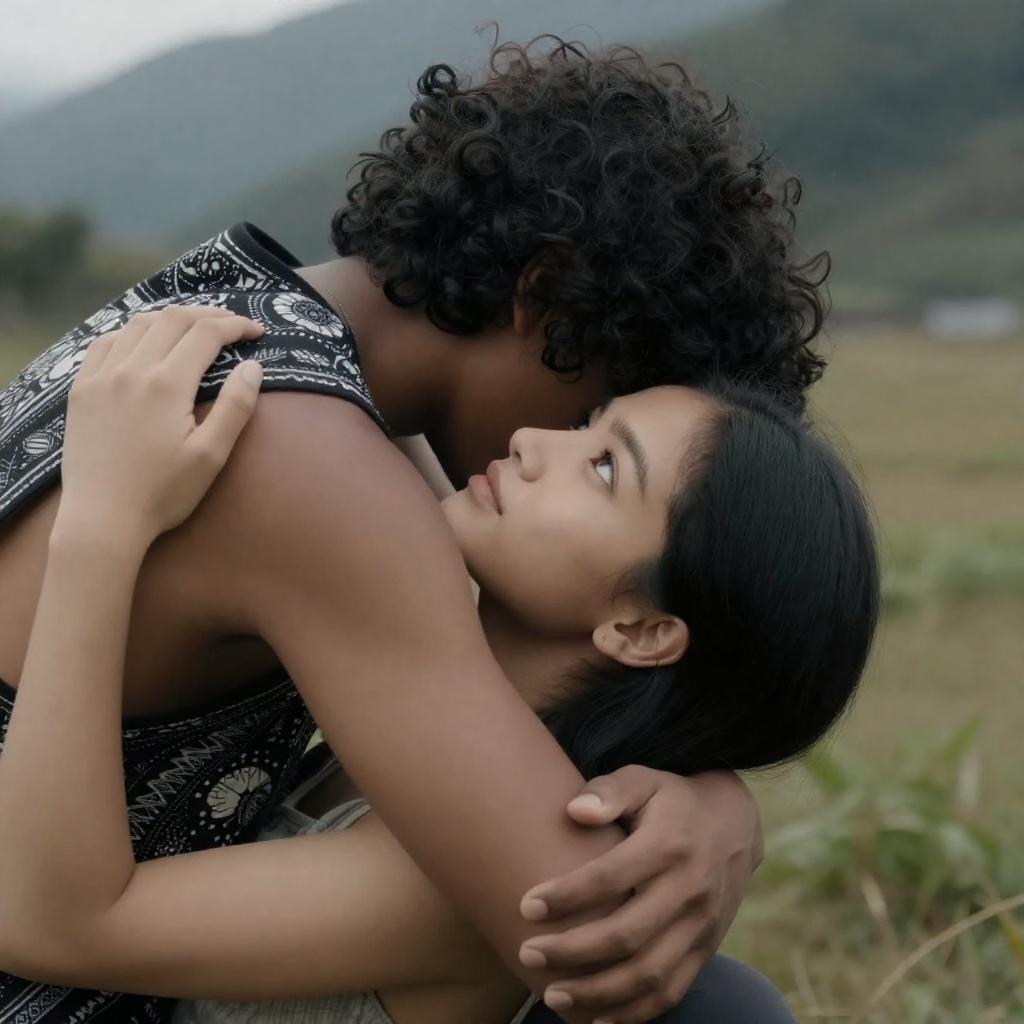 Young woman with light brown skin and straight black hair, lying on back, looking up, arms wrapped around a person with curly black hair, wearing a black and white patterned garment, in a grassy, mountainous background.
