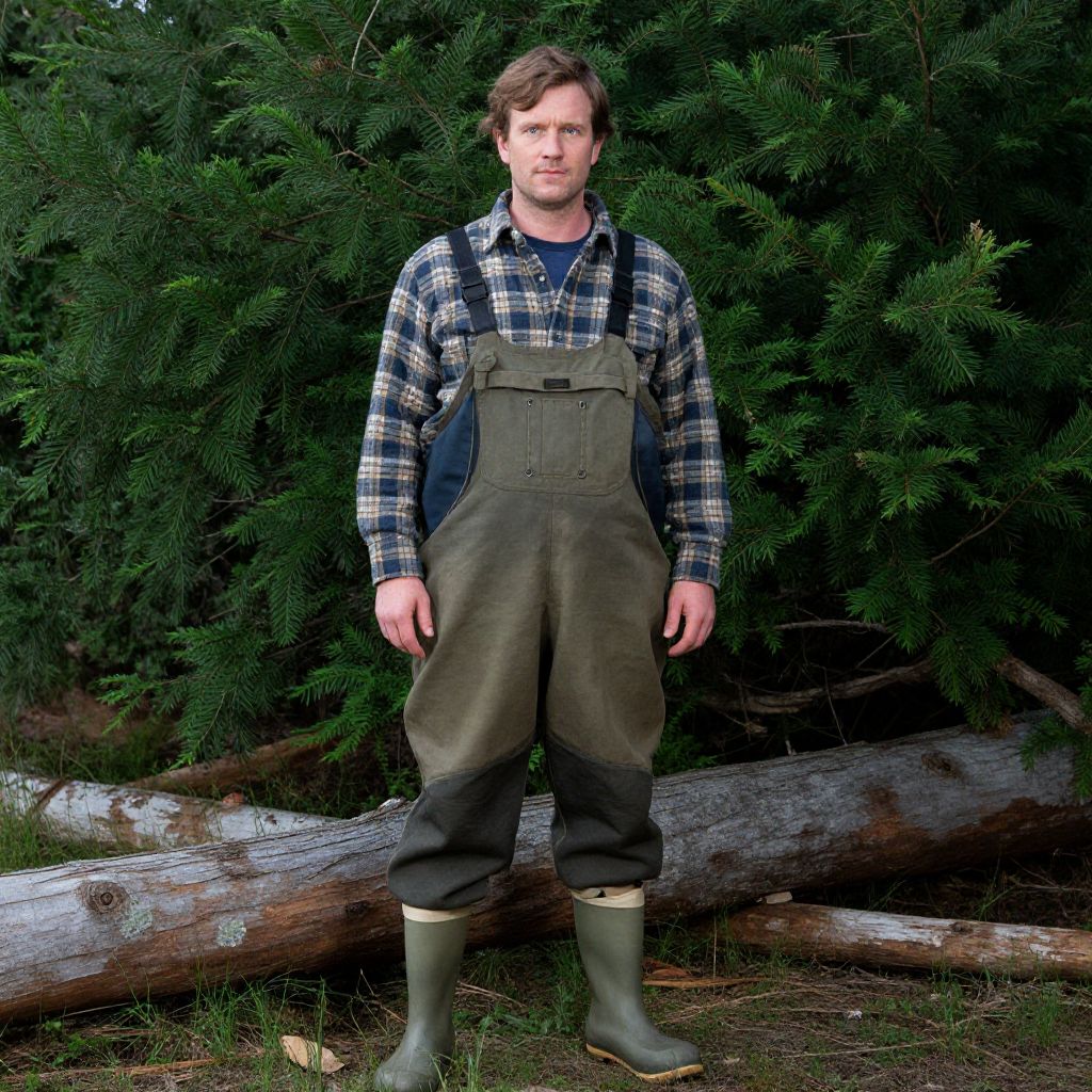 Photograph of a Caucasian man standing outdoors against a backdrop of dense, dark green pine trees. He has light brown, wavy hair and a serious expression. He wears a blue and black checkered flannel shirt under olive green, knee-length overalls with suspenders, and green rubber boots. A large, weathered log lies horizontally in the background on the ground. The ground is earthy with scattered leaves. The man stands with his legs slightly apart, hands loosely by his sides, in a natural, forested setting.