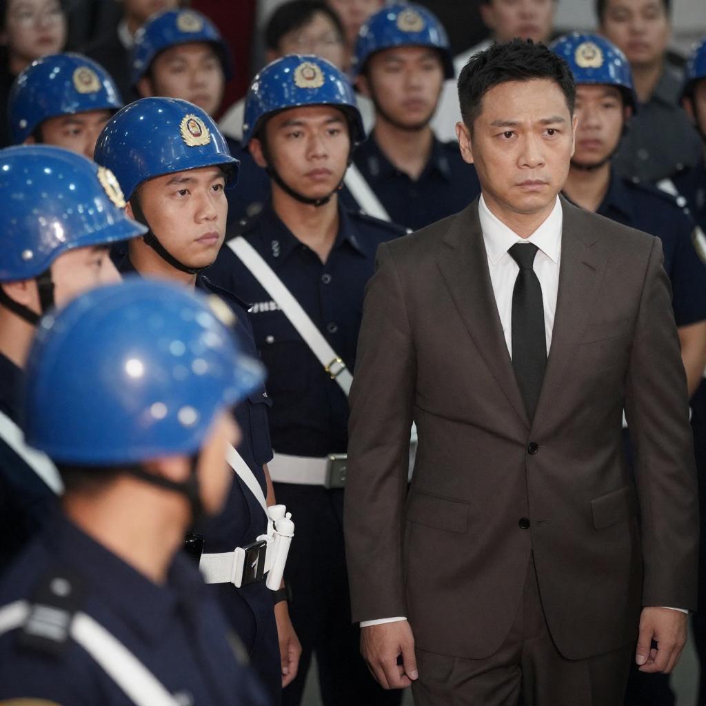 Close-up portrait of a middle-aged Asian naval officer wearing a black cap with gold accents and a black uniform with white shirt. Raindrops are visible on his face and cap, highlighting the rainy weather. His expression is intense and focused, with a blurred background featuring other uniformed personnel.