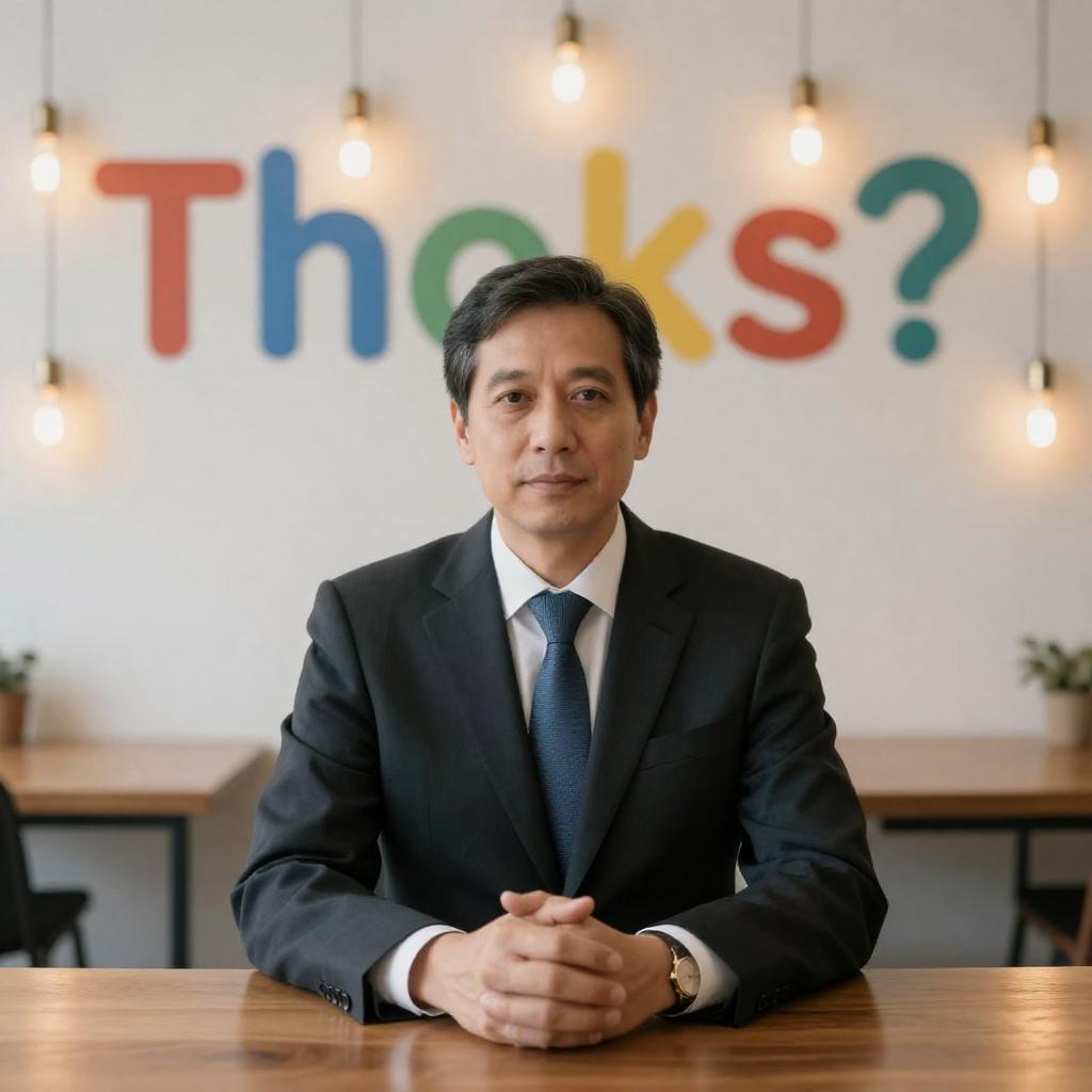 Photograph of a middle-aged man in a dark suit and blue tie sitting at a wooden table, hands clasped. Large, colorful "Thoughts?" on the wall behind him. Light bulbs create a glow around the . Neutral expression. One person partially visible on the left.