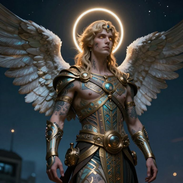 A hyper-realistic, retro-futurist steam punk male angel with intricate tattoos and a glowing halo, rendered in an art deco style, gazes into the night sky with glowing eyes.