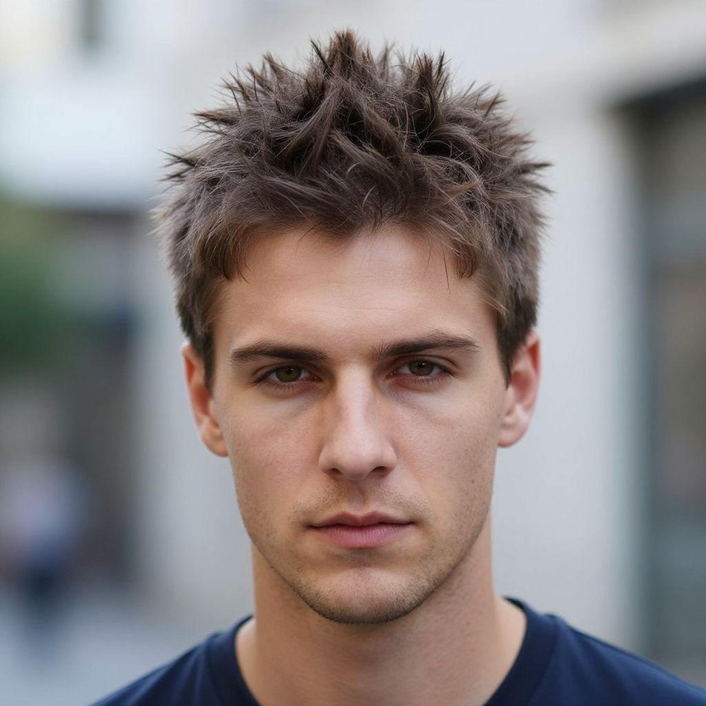 Modern Spiky Hair, fit European man, confident expression, realistic photography, urban environment, modern aesthetic, high quality details