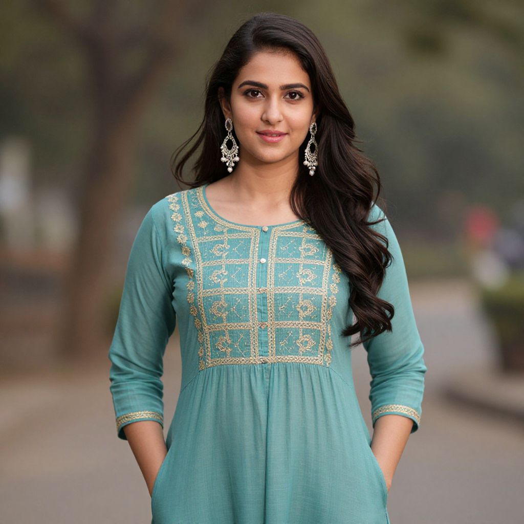Photograph of a young Indian woman with long, wavy black hair standing outdoors. She wears a light turquoise, long-sleeved kurta with intricate gold embroidery on the chest area. Her hands are in her pockets, and she has large, ornate silver earrings. Her skin tone is medium brown, and she has a calm expression. The background is blurred, featuring trees and a pathway, suggesting a park setting. The overall style is traditional Indian attire, and the lighting is natural, highlighting her face and outfit.