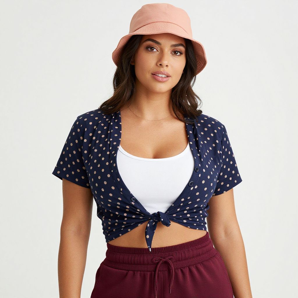 "Woman, casual sporty, short-sleeved button-up shirt with a navy base and tan polka dot pattern, cropped to waist, white scoop-neck tank top underneath, maroon sporty joggers with elastic waistband, bucket hat in a soft peach color, white background.. Sexy. Pretty face and beаutiful eyes. Big breasts."