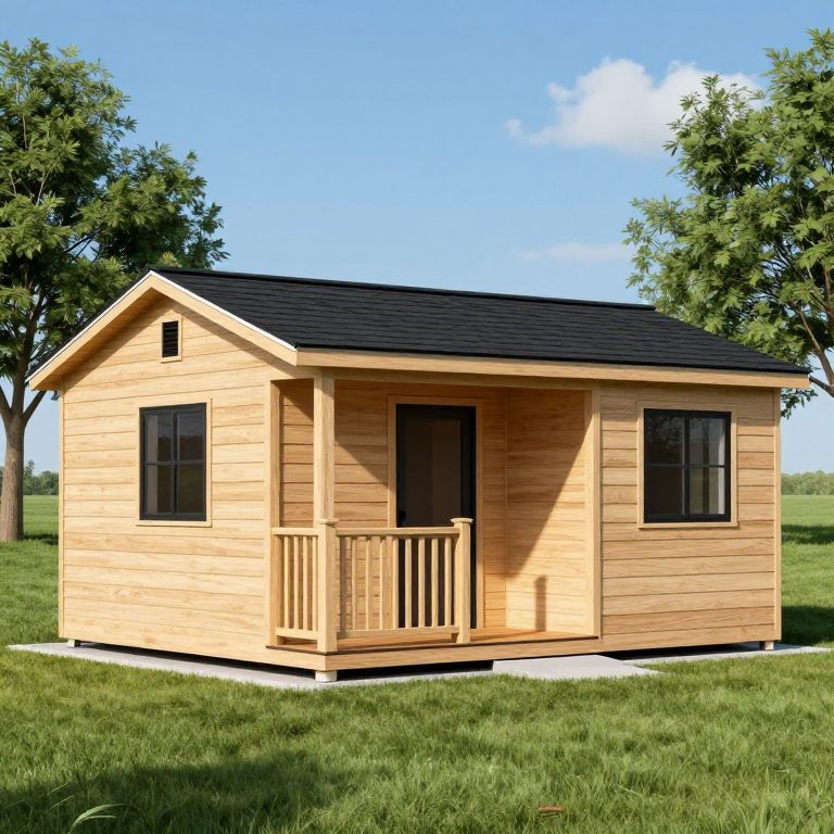 Modern 12x28 shed plan featuring a contemporary design with light wooden siding, a black shingle roof, and a front porch supported by wooden railings, surrounded by green grass and trees under a clear blue sky.