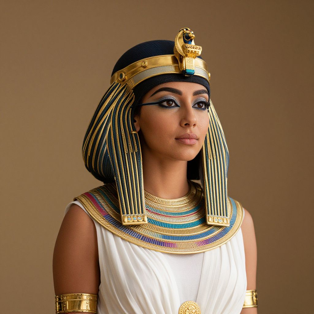Ancient egyptian woman costume, a close up of a woman in a white dress and a gold headdress