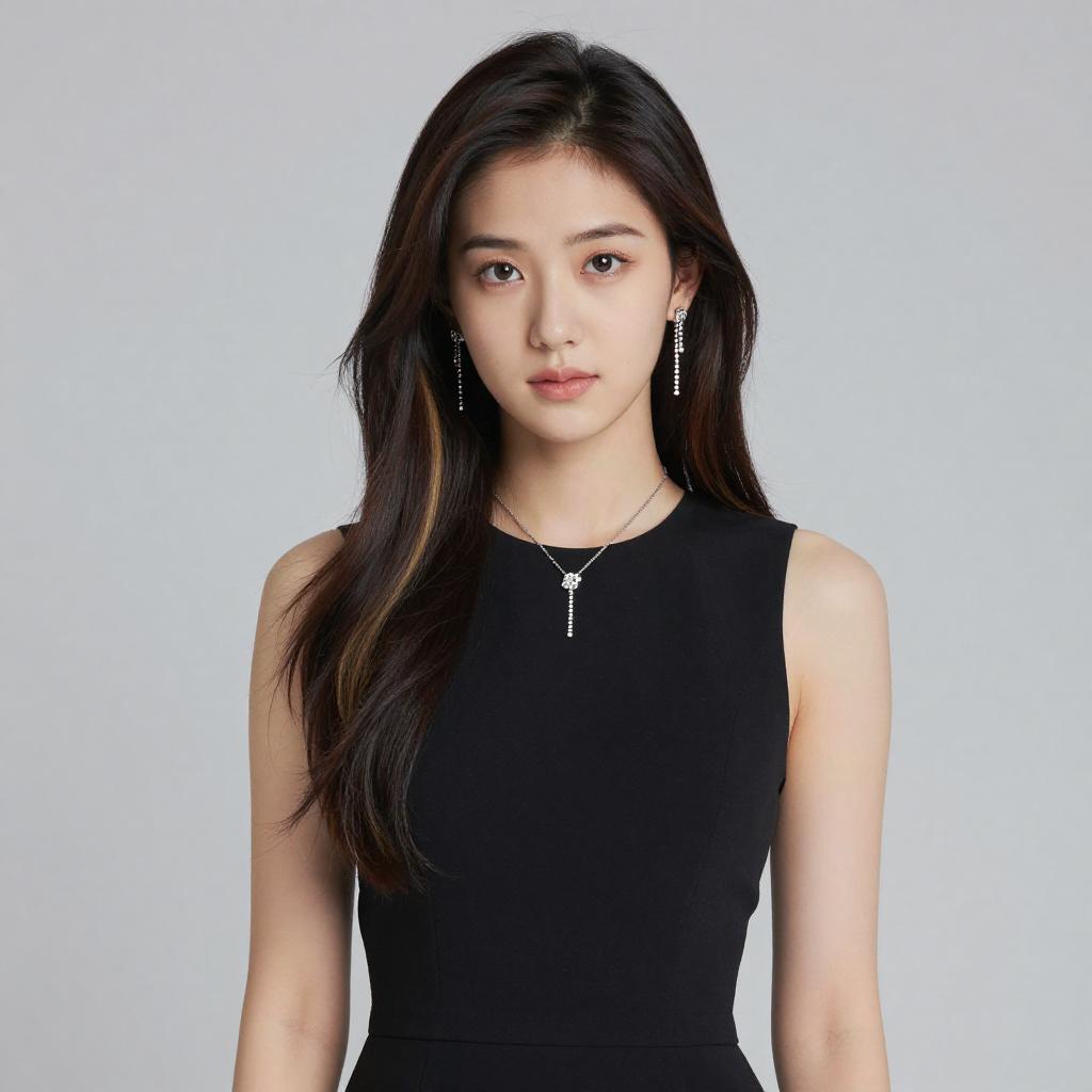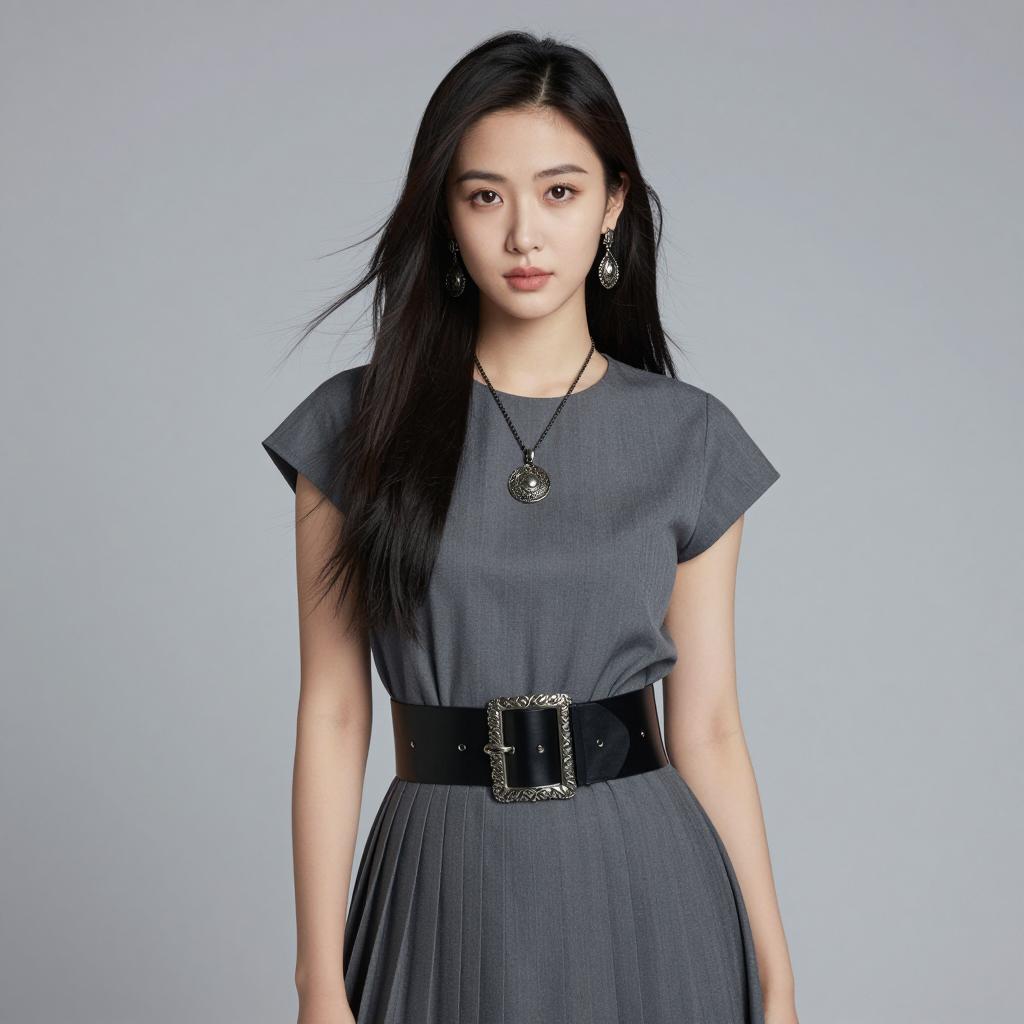 Studio portrait of a young woman with long black hair wearing a pleated grey dress with a wide black belt featuring a decorative buckle. She accessorizes with ornate silver earrings and a pendant necklace, standing against a neutral grey background with a calm and confident expression.