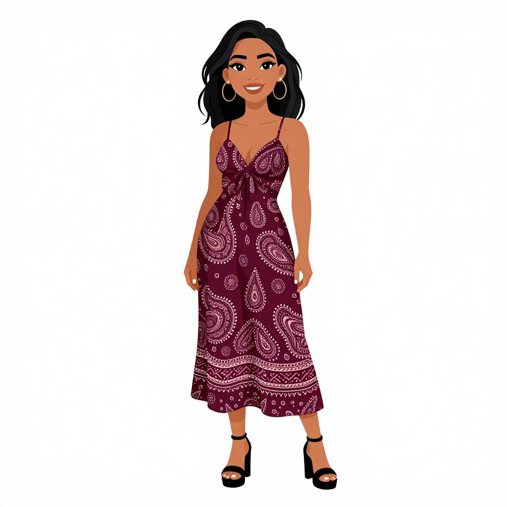 Woman with pretty face and pretty hair. smiling Woman, bohemian, loose-fitting midi dress with paisley pattern in burgundy and lighter hues, spaghetti straps, scoop neckline, draped harem style silhouette, ankle-length hem with gathered detail, black platform sandals with chunky heels, minimal jewelry. --sref 1467