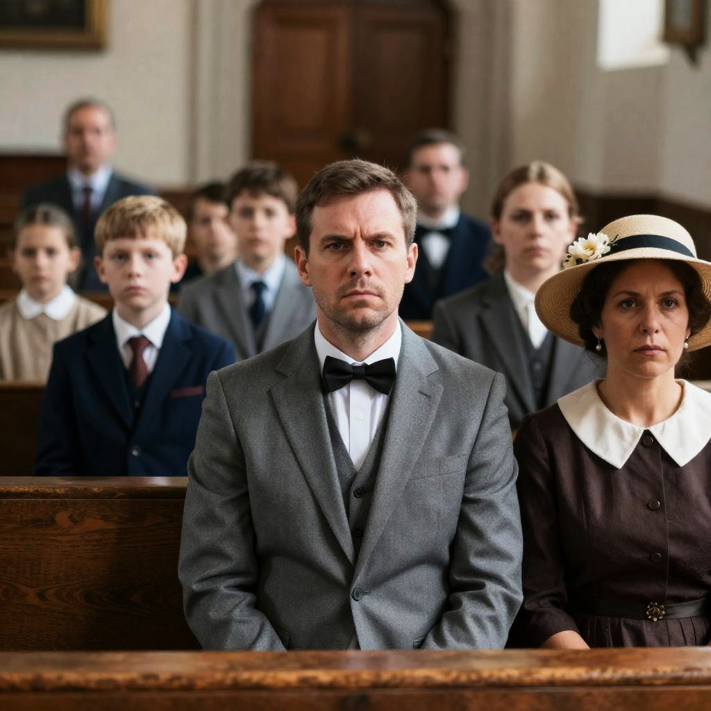 Photograph of a church congregation. Front row: middle-aged man in gray suit with black bow tie, stern expression; woman in brown dress with white collar, hat adorned with flowers, serious expression. Background: children, adults in period clothing, wooden pews.