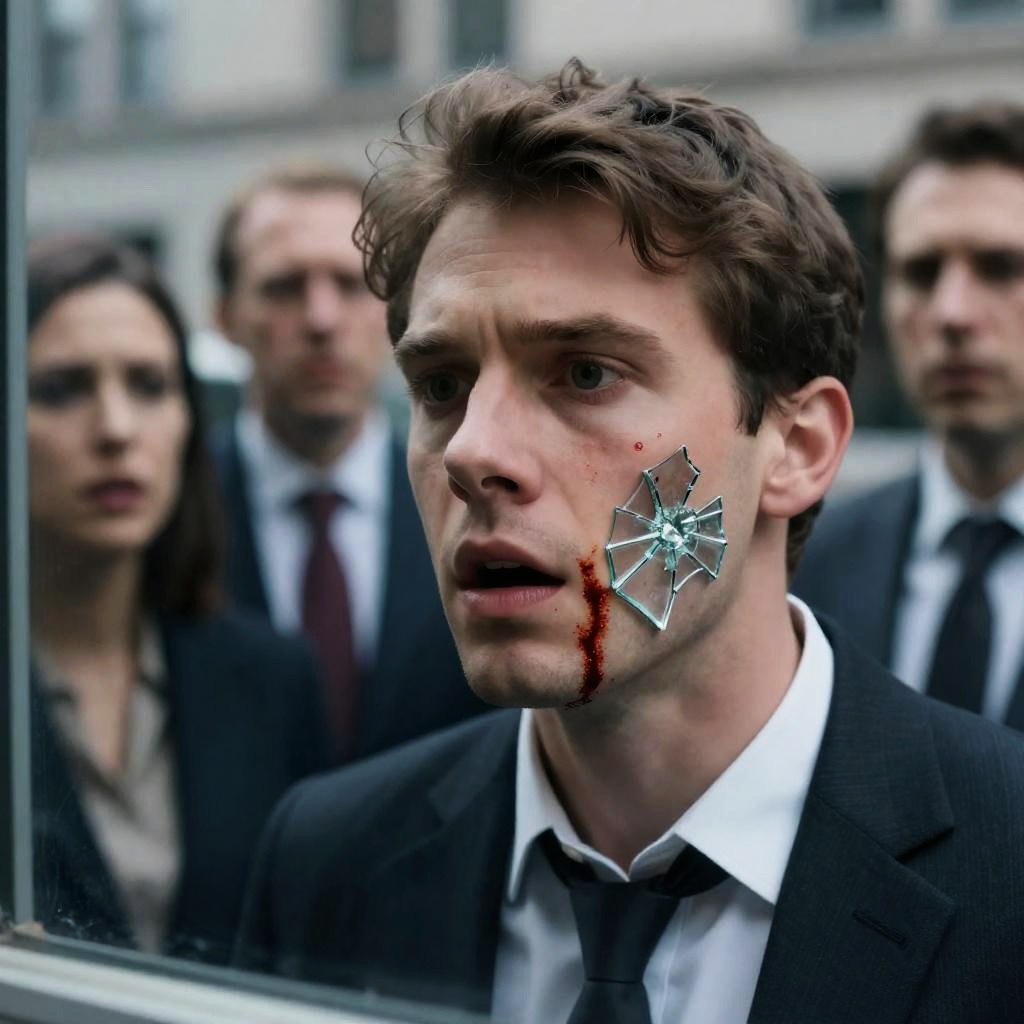 Close-up of a shocked man with a shattered glass in his cheek, blood on his face, reflected in a window. Background: three people in suits, concerned expressions, urban setting.