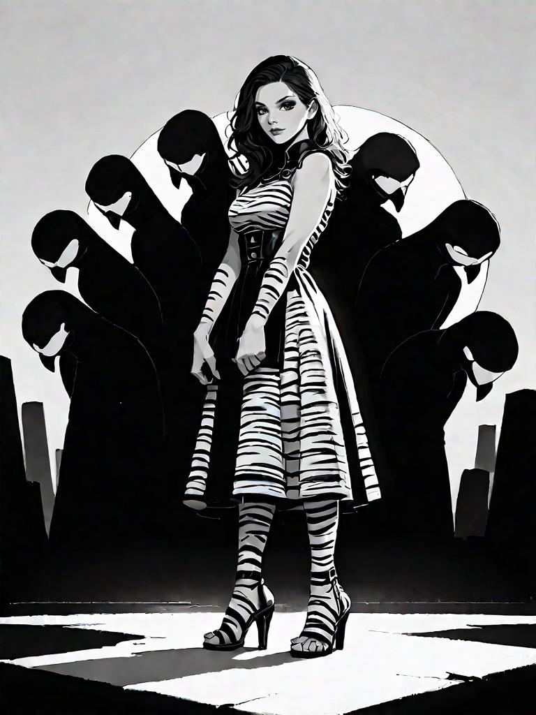 Black and white digital artwork featuring a stylish woman with a realistic face wearing a chic, sleeveless, black and white striped sheath dress with mid-calf length. She stands confidently in strappy heeled sandals, surrounded by abstract shadowy figures set against a minimalist black and white background.