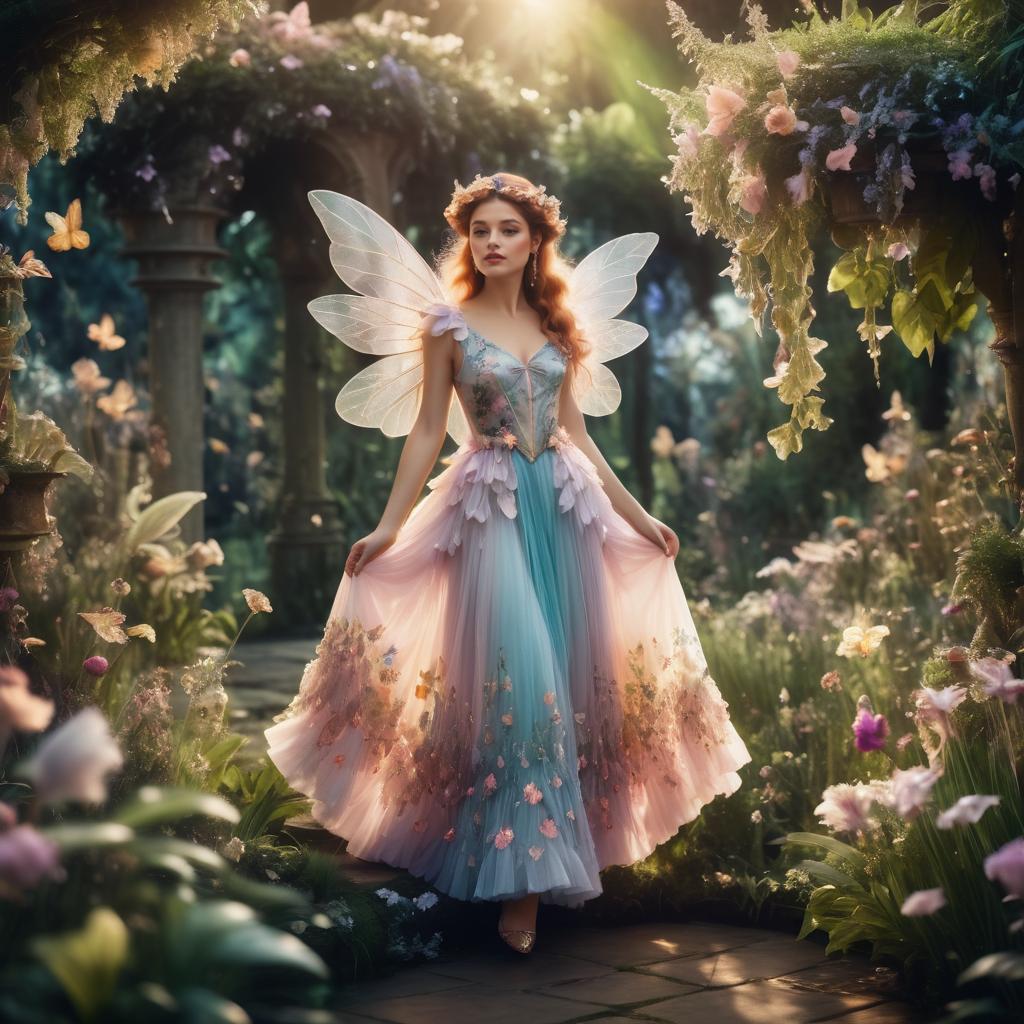 Gorgeous fairy with delicate wings and a floral dress in a magical garden. Styled as fashion photography, with costume design influences by Cicely Mary Barker, cinematic color grading, and high detail, 8K.