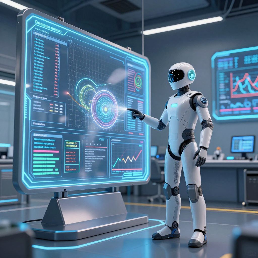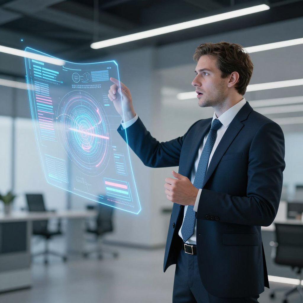 Femdom ai prompt: A futuristic lounge where a female AI conductor uses gestures to guide a network of glowing nodes. The environment reflects sleek design, ambient light, and immersive technology. She is elegant, in control, and in complete harmony with the AI system, symbolizing empowerment through intelligent technology.