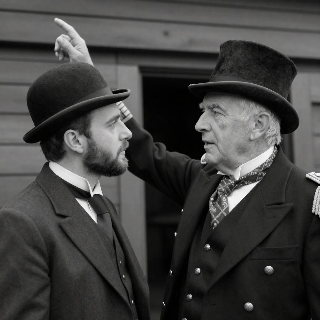 Black-and-white photograph of two elderly men in top hats and dark coats, facing each other. The older man on the right holds a small white object, gesturing towards the younger man on the left. Both have intense expressions. Background features large window with grid pattern. The older man wears a fringed scarf. The younger man has a light scarf. The setting is indoors.