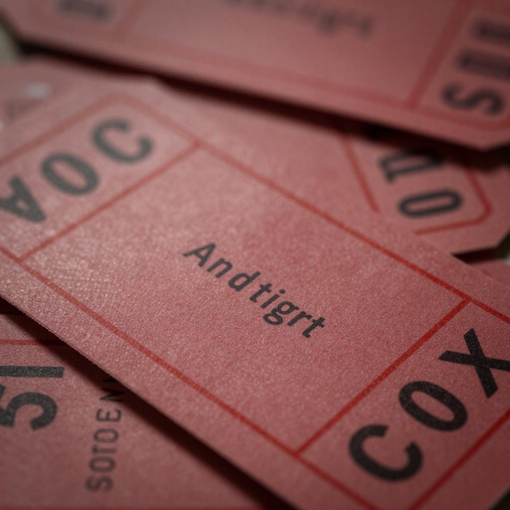 Macro shot of red admission tickets with textured surface and visible perforations. The ticket in focus shows the text 'Andtigrt'. The image features warm, dim lighting and shallow depth of field, blurring tickets in the background.
