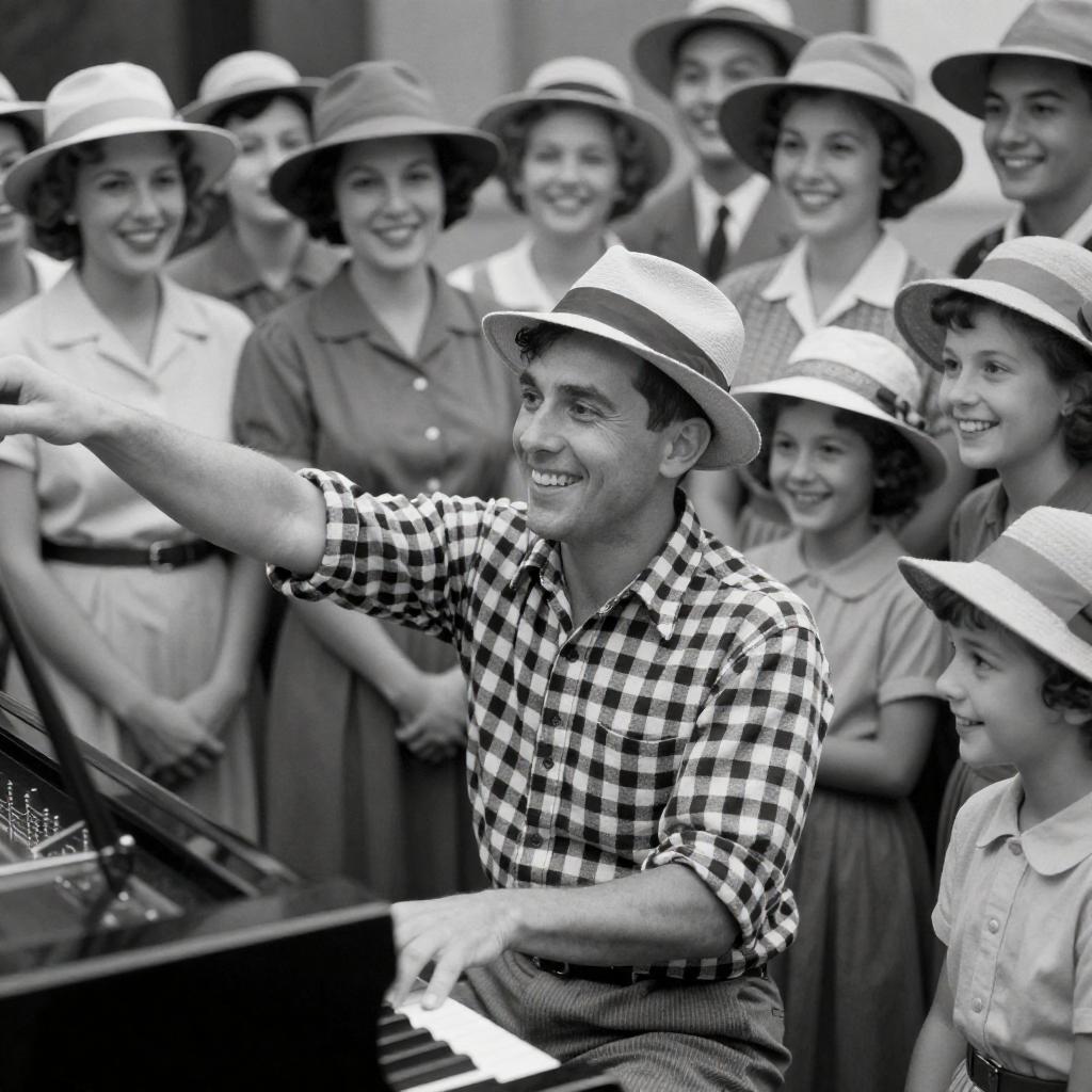Black-and-white photograph of a performer playing a piano, wearing a checkered shirt and hat, surrounded by a smiling crowd of women and children in vintage clothing. Performer's arm extended, smiling. Women in dresses, children in hats. Bright expressions. Piano in foreground. Group tightly packed. Vintage hats and patterns. Performer centered, crowd around.