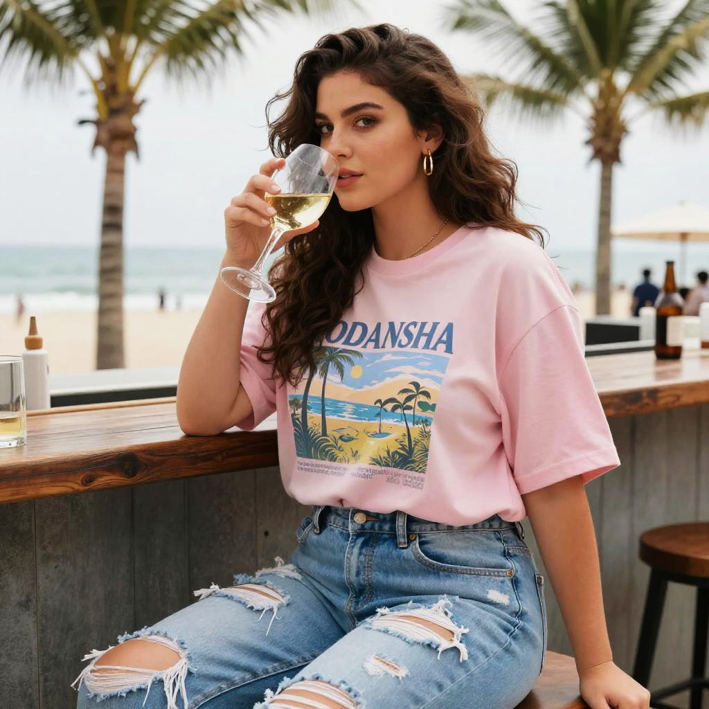A Curvy woman in a kodansha comics style, wearing a pastel oversized graphic t-shirt with a landscape print and distressed light blue jeans, sitting at a beach bar under palm trees, enjoying a glass of wine. Sexy. Pretty face and beutiful eyes