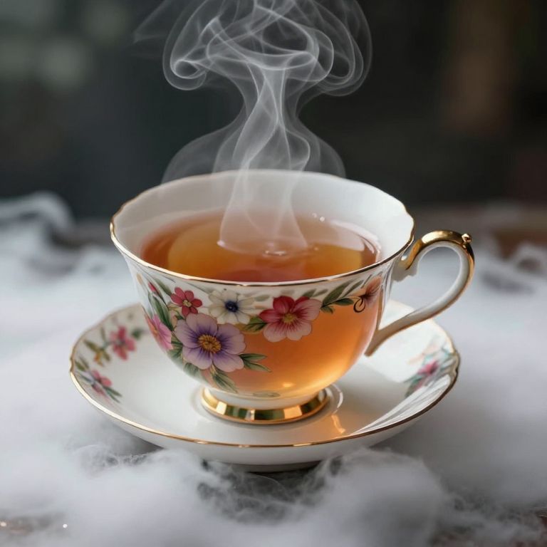 Photograph of a floral-patterned teacup with gold trim, steaming hot tea, on a matching saucer, surrounded by mist. Dark