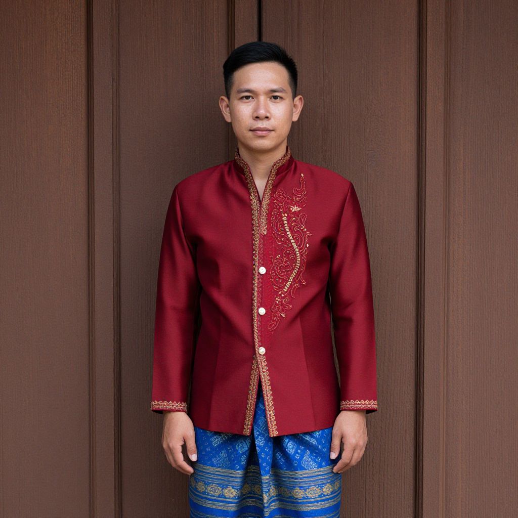 "Thai Traditional Dress Man, man in a red and blue outfit standing in front of a wooden wall"
