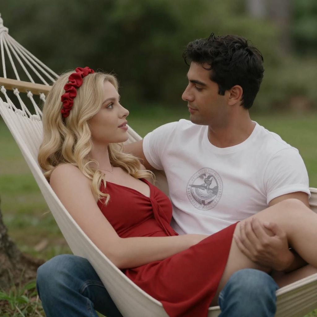 Photograph of a couple in a yellow-striped hammock. Man in brown suit, red tie, and dark hair, sitting behind woman in blue dress with pink feather trim, dark hair. Woman looks at camera, man looks at woman. Close-up profile of man on left. Grass background, daytime.