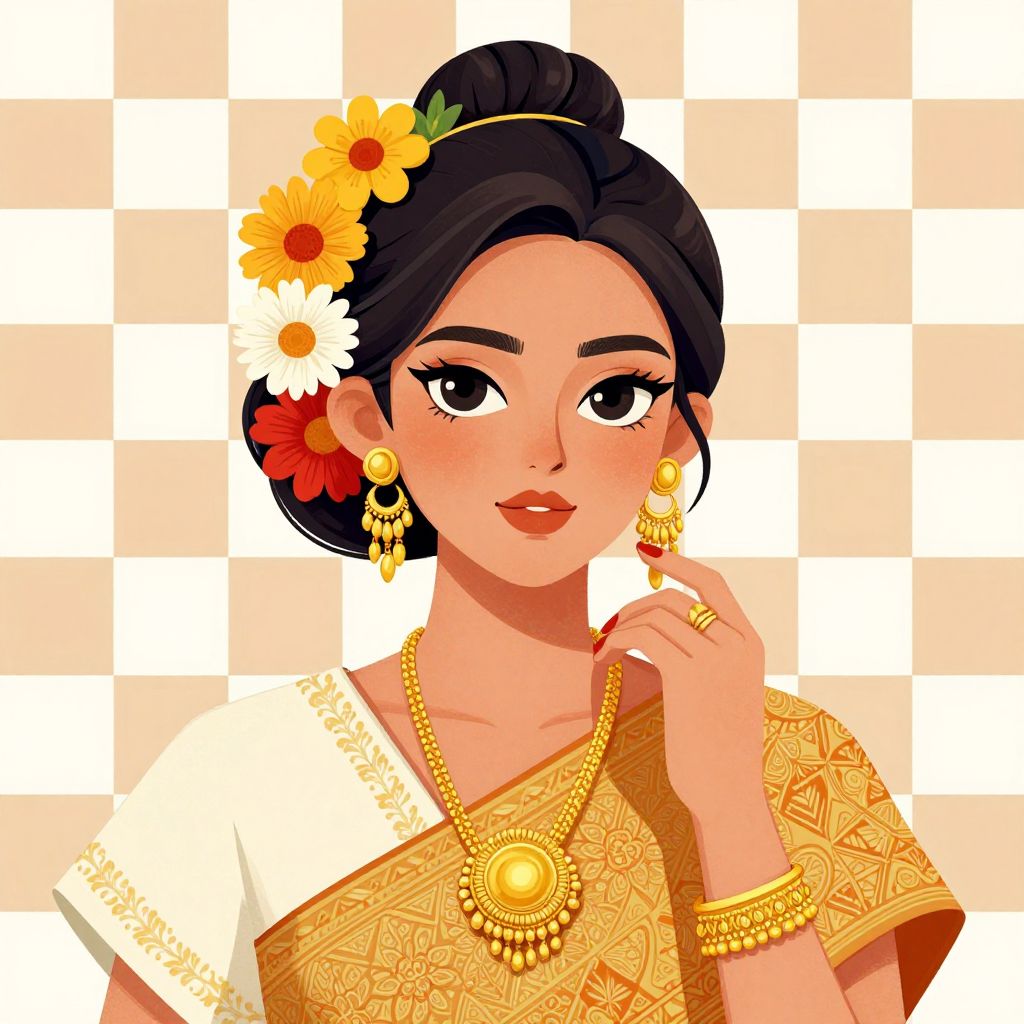 A vibrant digital illustration featuring a woman with dark hair adorned with colorful flowers, wearing traditional attire and gold jewelry, set against a checkered background, capturing a stylized and culturally inspired aesthetic.