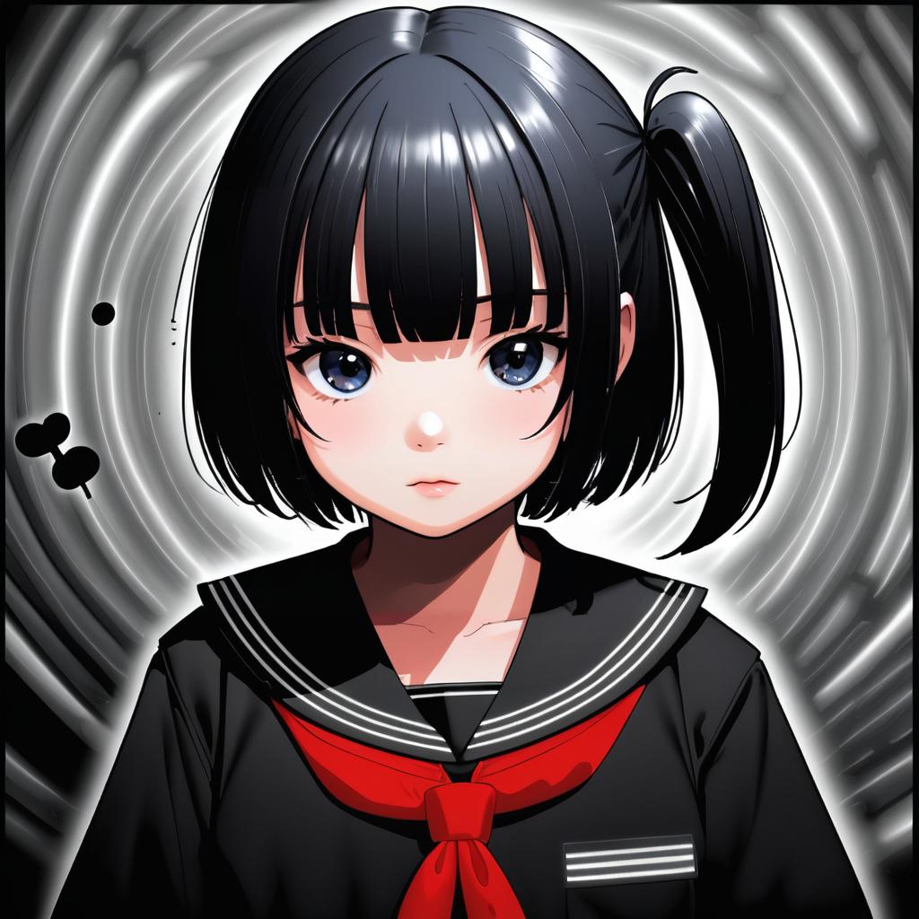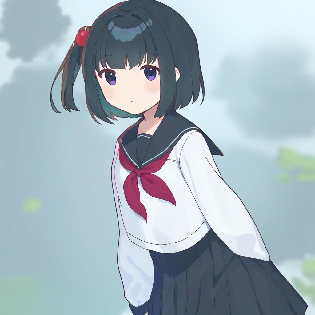 Amemori sayo, nijisanji, 1girl, black eyes, black hair, short hair, sidelocks, serafuku, pleated skirt, serafuku, black skirt, black sailor collar, long sleeves, virtual youtuber, virtual youtuber, one side up, red neckerchief, by artist ar (rikuesuto), leet