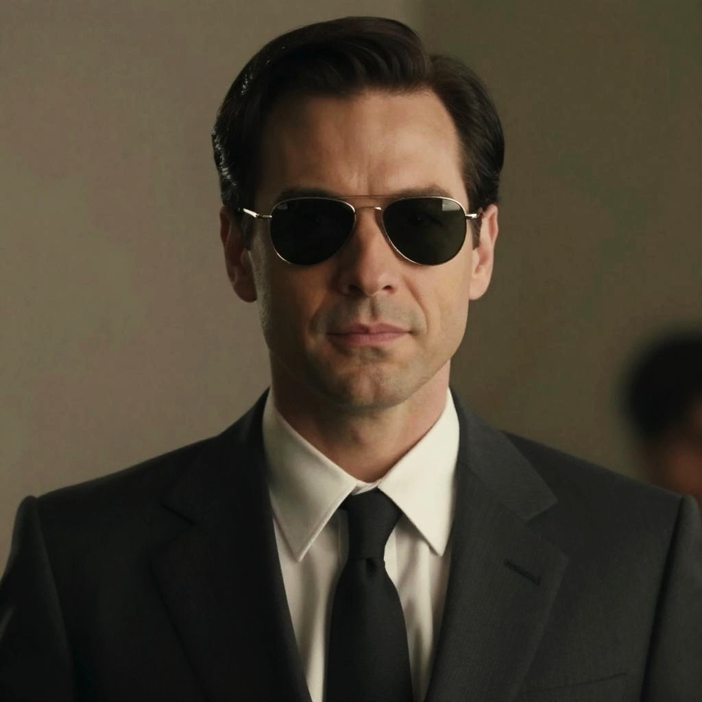 Photograph of a man with fair skin and dark brown hair, styled neatly. He wears black aviator sunglasses, a black suit jacket, a white dress shirt, and a black tie. His expression is neutral, lips slightly closed. The background is blurred with a grayish tone, suggesting an indoor setting. The lighting highlights his face and upper body, casting subtle shadows. The overall style is formal and sophisticated.