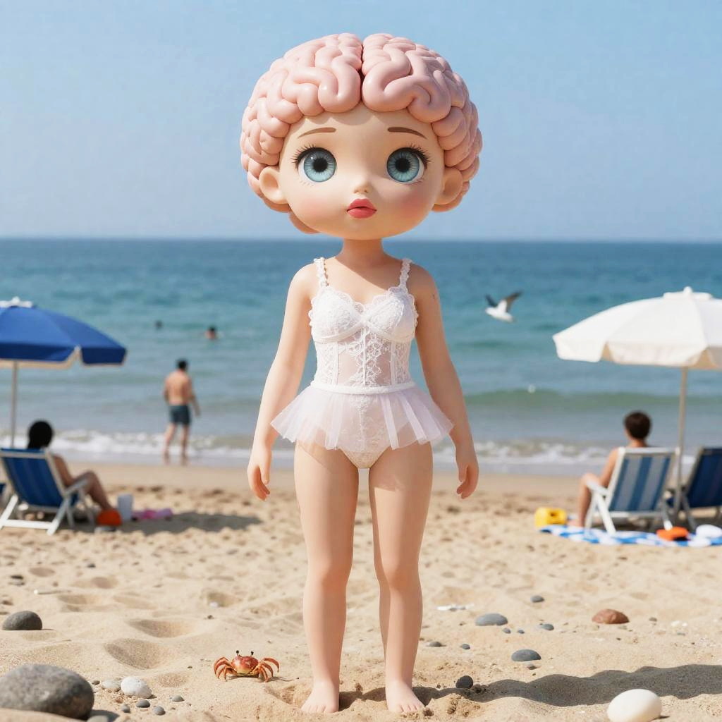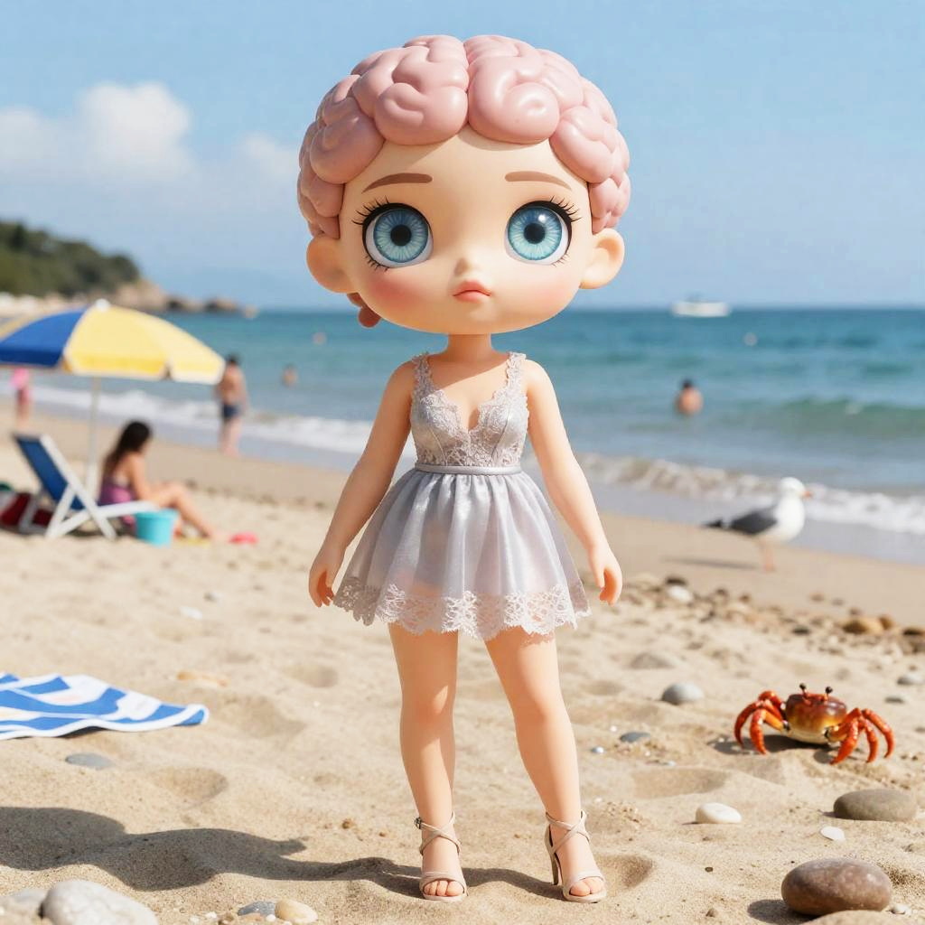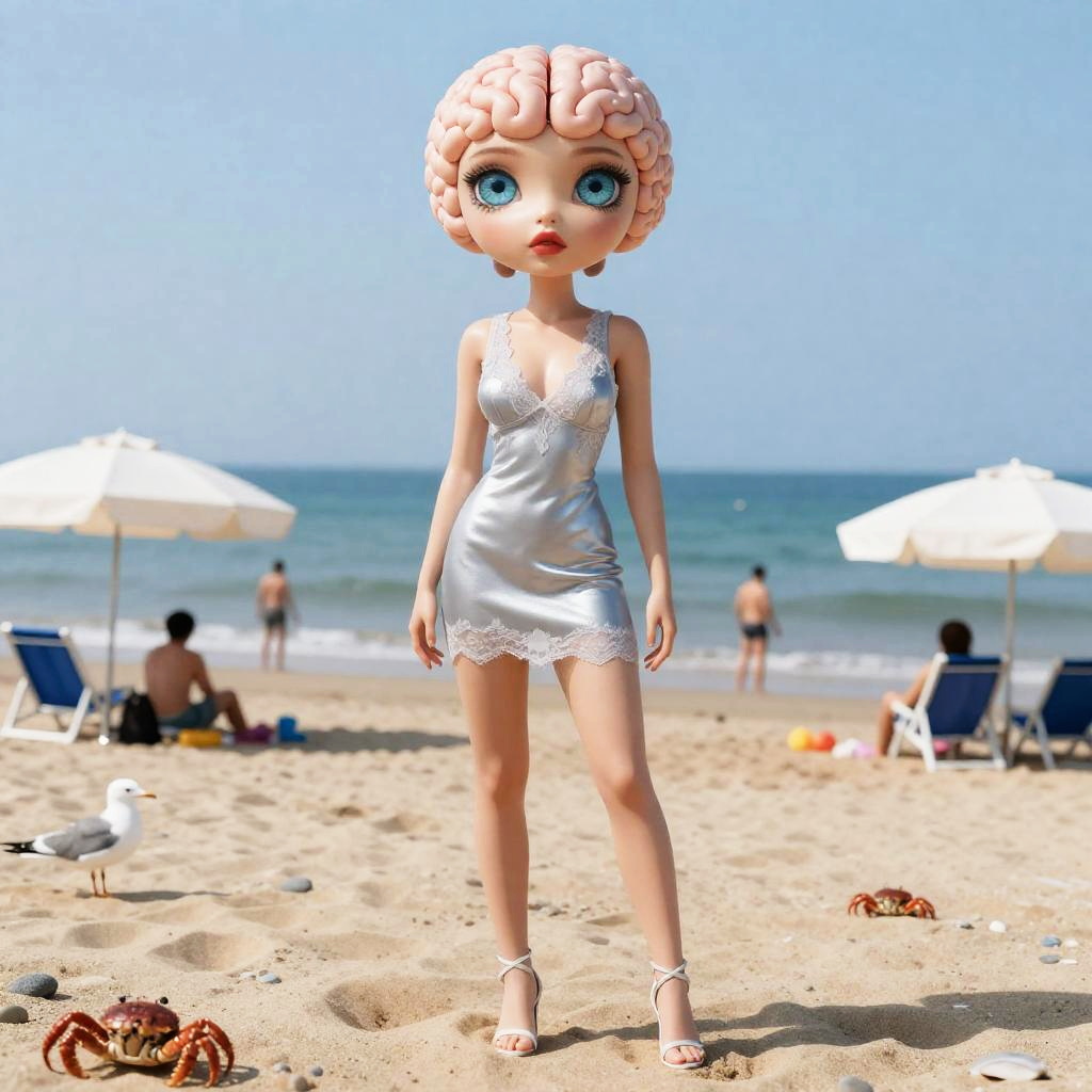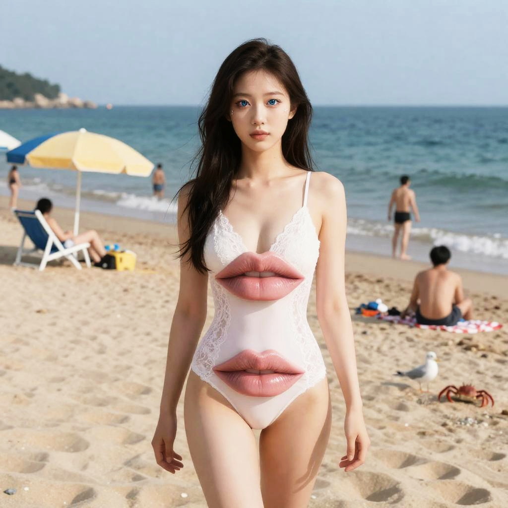 ((best quality)), ((masterpiece)), (detailed), nsfw, photorealistic, ultra high res, intricate, hyperdetailed, (skindentation), cute, feminine, detailed body, (detailed face:1.1), (outlined iris), (hidrocor lenses), (perfect eyes), 4k, beautiful, full body, Sand or pebbles covering the ground, horizon, views of the ocean or nearby land, People swimming, sunbathing or playing beach games, Beach umbrellas, towels, beach chairs, other equipment used by beach-goers, Marine life such as seagulls, crabs, or fish swimming in the water)a( Brain hacking and Cyber-mindfulness and Mech-suit and Cybersports and Technological determinism )Lace, Taffeta gold lamé lace-and-taffeta babydoll mini dress with corset boning, sheer side panels, cybernetic shoulder pauldrons, holographic waist sash and thigh-high lace-up gladiator boots(massive lips: 1.3) and (huge lips:1.3) (parted lips:1.3) and (lips filler:1.3), (thick lips:1.3), and (gigantic breasts:1.2) and (huge breasts:1.2) and (massive breasts: 1), wide hips, thick thighs, midnight blue-to-violet balayage, edgy pixie cut with a long asymmetrical fringe and several micro-braids tucked behind one ear, art by William-Adolphe Bouguereau and Edward Hopper