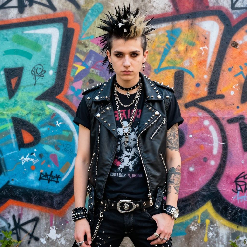 This vibrant image captures a young individual with a striking punk hairstyle and edgy fashion, standing confidently against a backdrop of colorful graffiti. Their studded leather attire and bold accessories reflect a rebellious spirit, merging the trashy and sassy elements of punk culture.