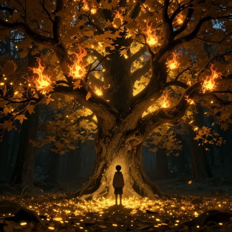 A young figure stands in awe beneath a colossal, gnarled tree whose branches are adorned with luminous, flame-shaped leaves that seem to dance with life, casting an ethereal glow over the forest floor strewn with golden embers.