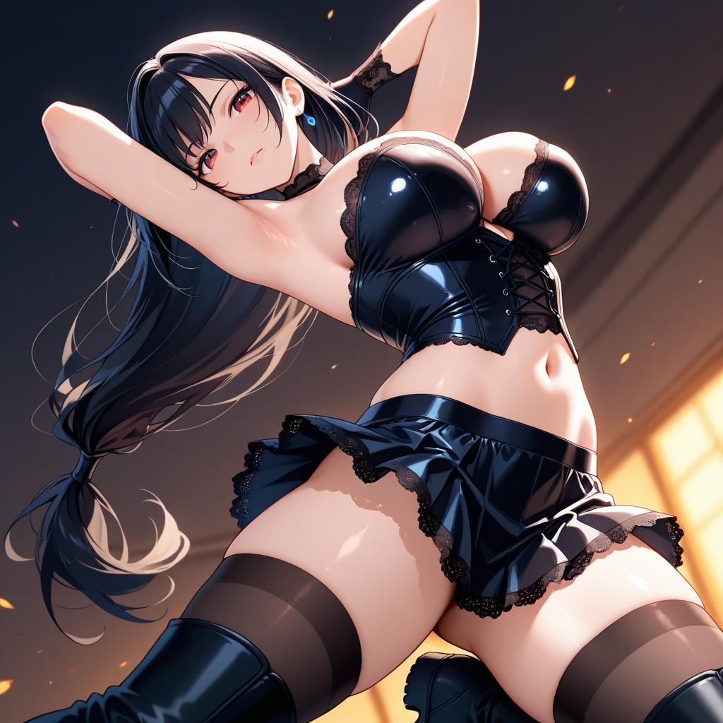 1girl, solo, long hair, black hair, low-tied long hair, red eyes, looking at viewer, parted lips, large breasts, navel, midriff, stomach, thighs, zettai ryouiki, combat boots, lace trim skirt, satin mittens, corset bustier, bare shoulders, armpits, jewelry, earrings, dynamic pose, anime style, vibrant colors, dramatic lighting, expressive stance.