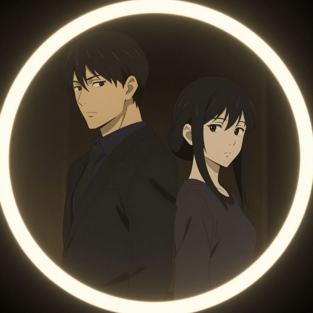 Two anime characters, a man and a woman, stand side by side within a circular frame, both dressed in dark formal attire, with the man wearing a black suit and the woman in a gray top, their expressions serious and contemplative.